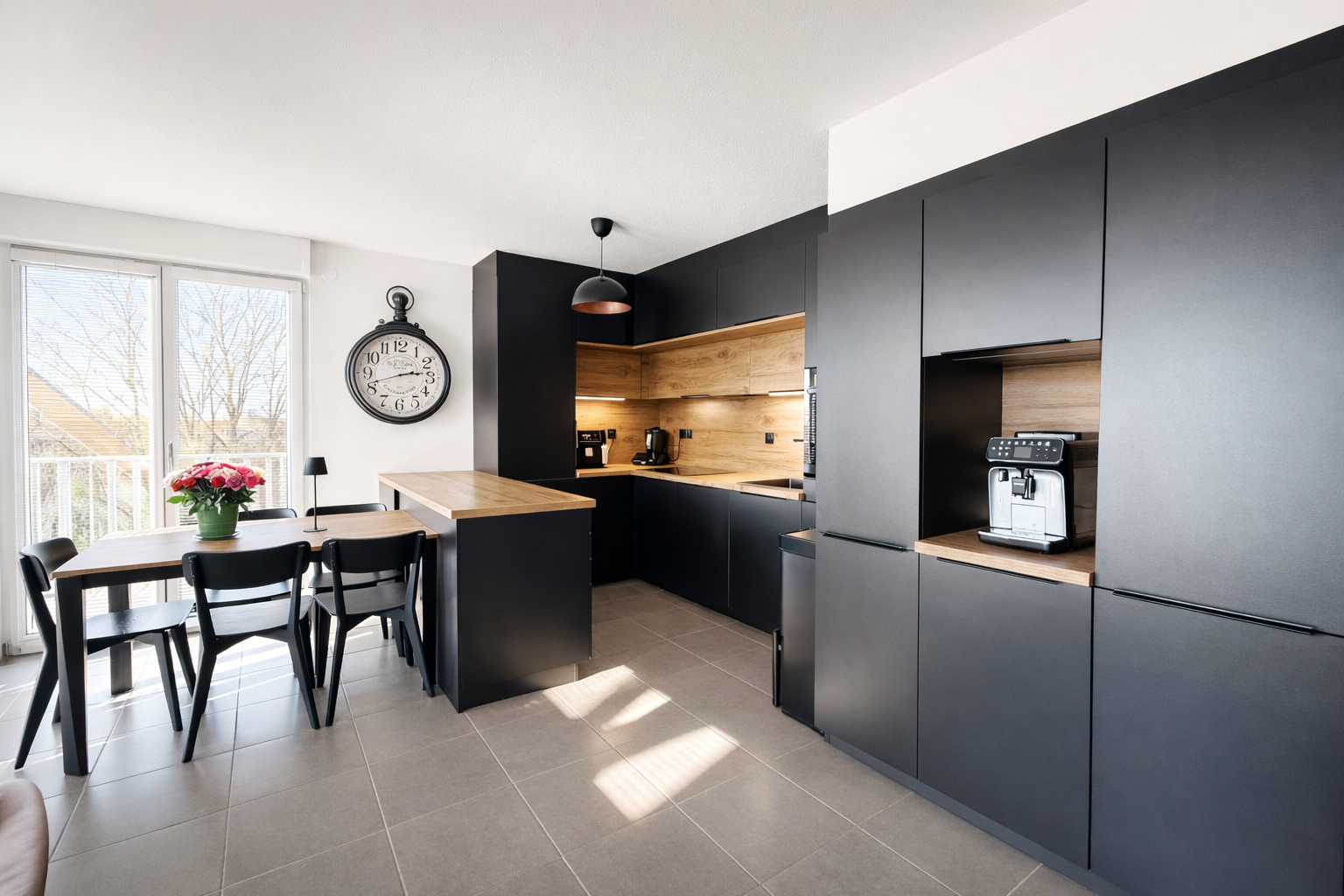 Le séjour, baigné de lumière grâce à son exposition ouest, offre une atmosphère chaleureuse. La cuisine SCHMIDT, aux lignes épurées et aux finitions soignées, s’intègre parfaitement à l’espace de vie pour créer un ensemble convivial et élégant.